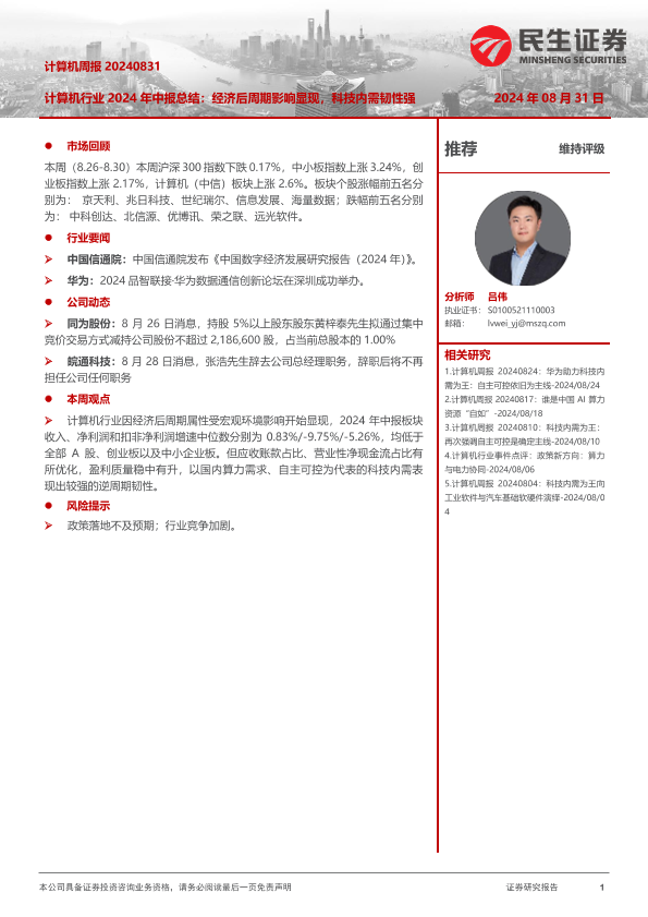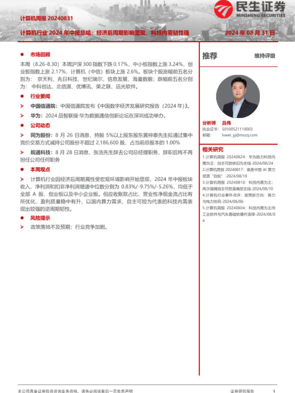 【民生证券】【20240831】计算机行业2024年中报总结:经济后周期影响显现,科技内需韧性强-18页