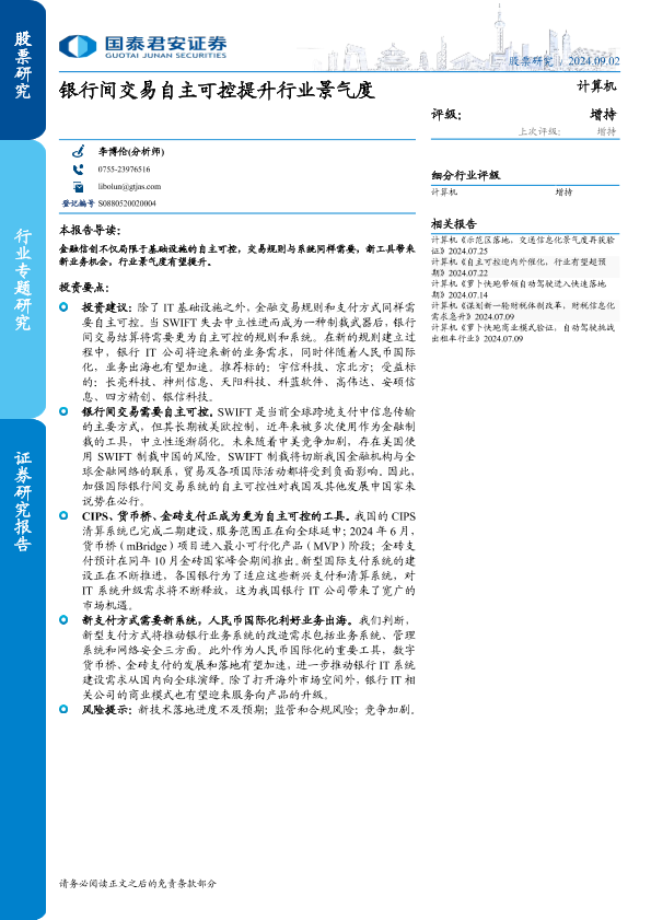 【国泰君安证券】【20240902】计算机行业专题研究:银行间交易自主可控提升行业景气度-19页