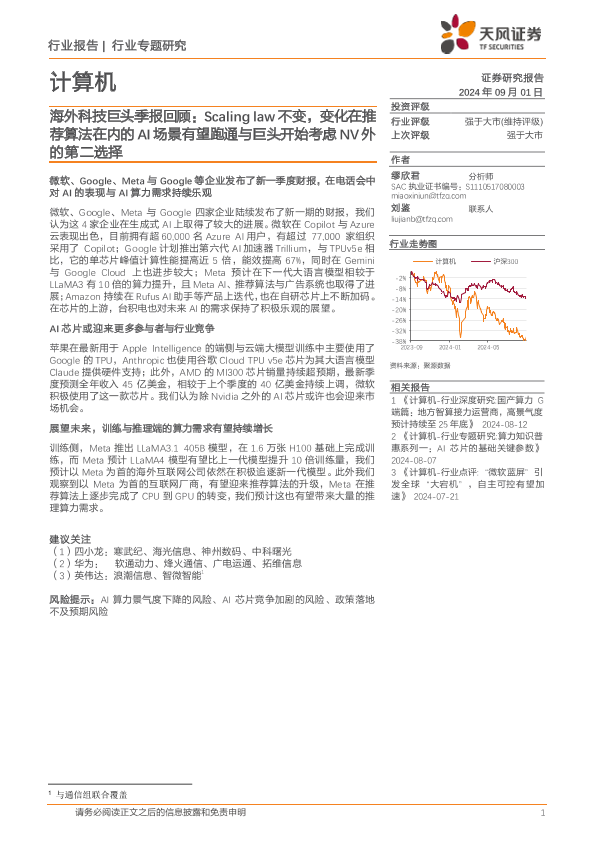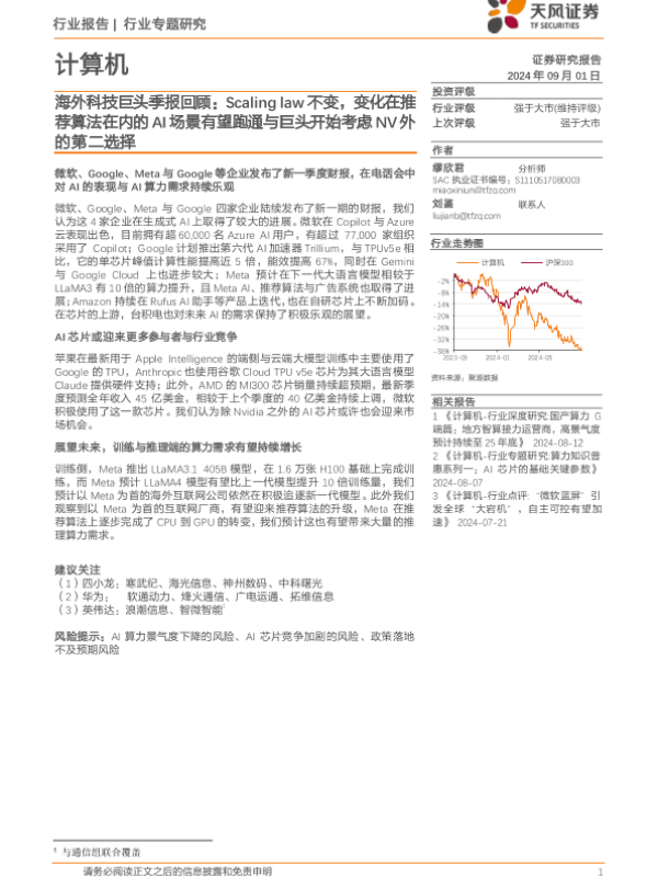 【天风证券】【20240901】计算机行业专题研究:海外科技巨头季报回顾,Scaling+law不变,变化在推荐算法在内的AI场景有望跑通与巨头开始考虑NV外的第二选择-15页