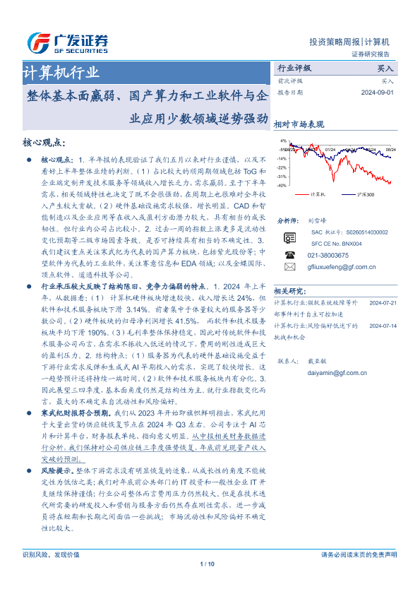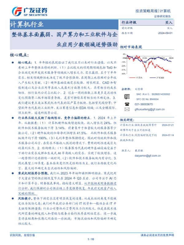 【广发证券】【20240901】计算机行业:整体基本面羸弱、国产算力和工业软件与企业应用少数领域逆势强劲-10页