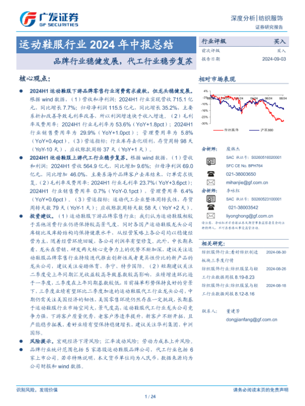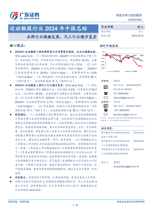 【广发证券】【20240903】运动鞋服行业2024年中报总结:品牌行业稳健发展,代工行业稳步复苏-24页
