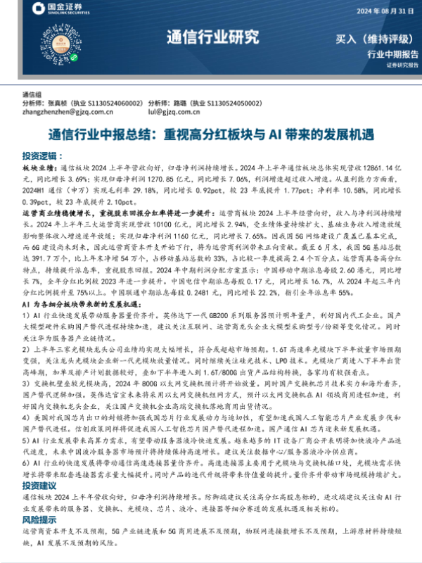 【国金证券】【20240831】通信行业中报总结:重视高分红板块与AI带来的发展机遇-23页