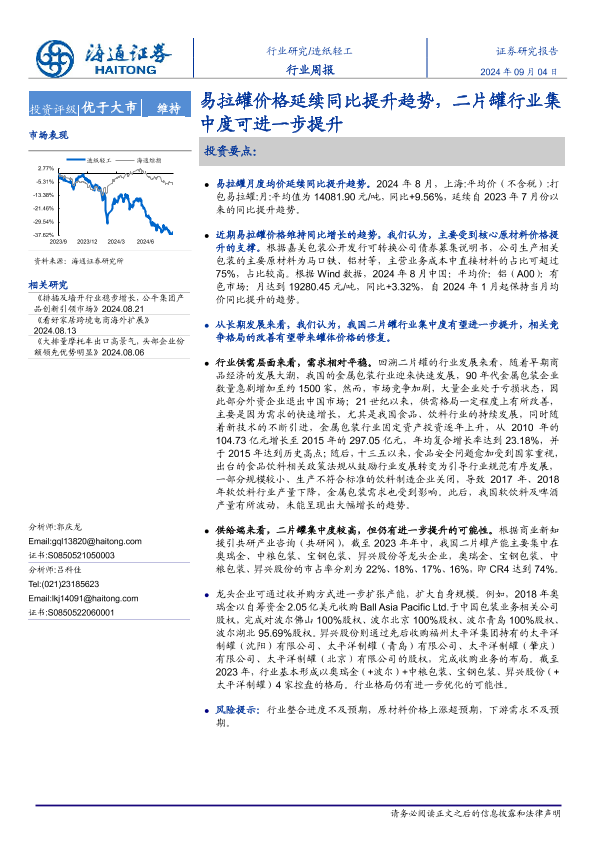 【海通证券】【20240904】造纸轻工行业周报:易拉罐价格延续同比提升趋势,二片罐行业集中度可进一步提升-10页
