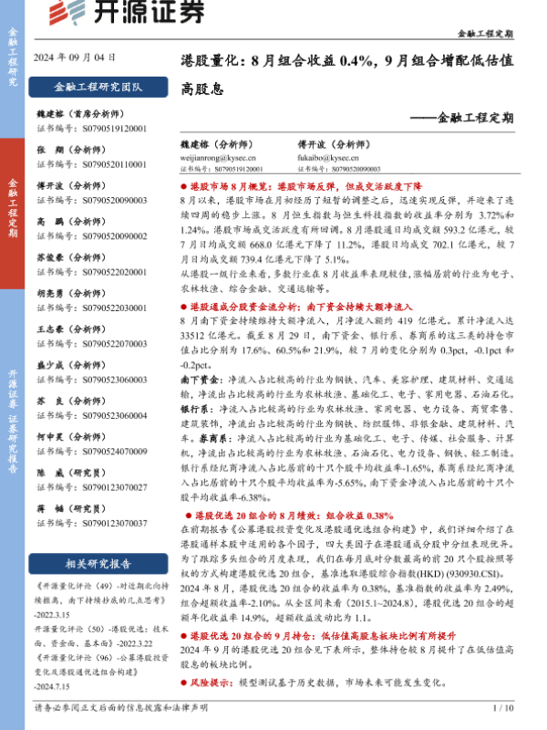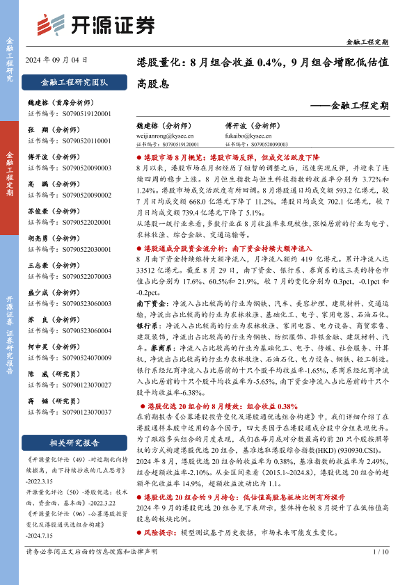 【开源证券】【20240904】金融工程定期-港股量化:8月组合收益0.4%,9月组合增配低估值高股息-10页