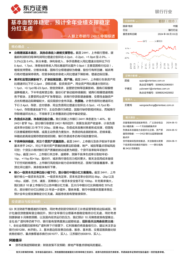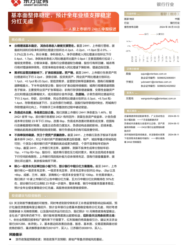 【东方证券】【20240903】银行业A股上市银行24H1中报综述:基本面整体稳定,预计全年业绩支撑稳定分红无虞-19页