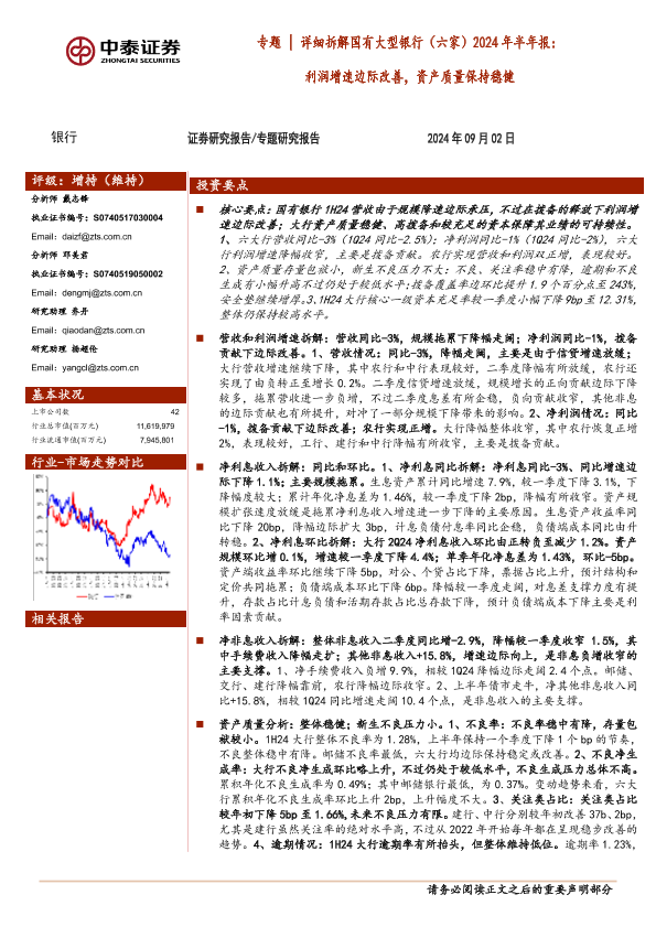 【中泰证券】【20240902】银行业专题|详细拆解国有大型银行(六家)2024年半年报:利润增速边际改善,资产质量保持稳健-18页