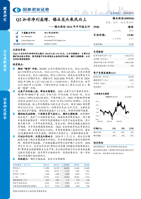 【国泰君安证券】【20240905】锡业股份(000960)2024年半年报点评:Q2扣非净利高增,锡业龙头乘风而上-11页