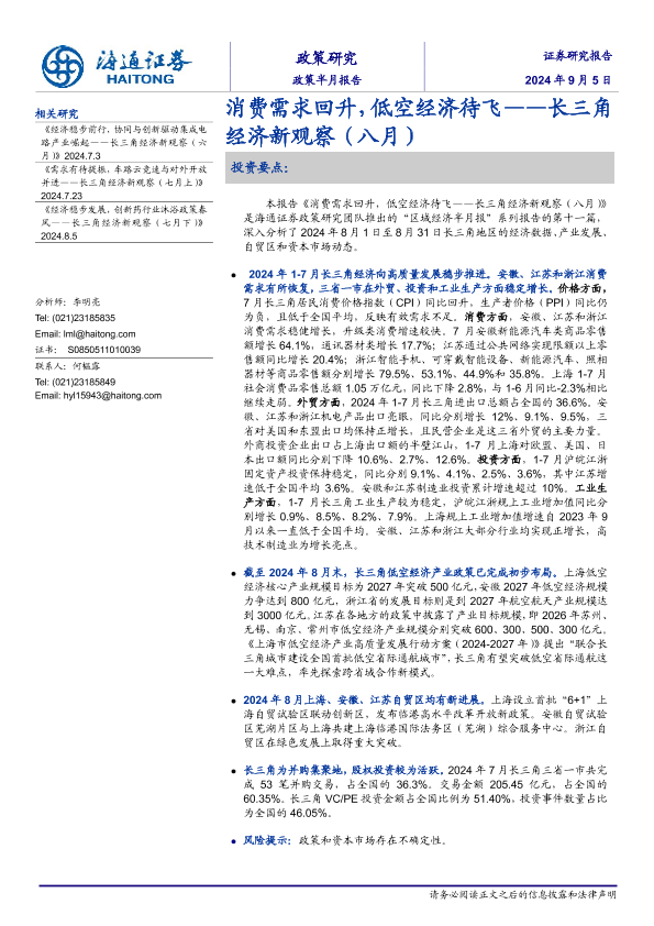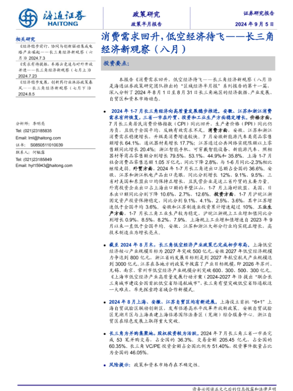 【海通证券】【20240905】消费需求回升,低空经济待飞——长三角经济新观察(八月)-14页
