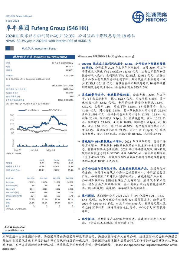 【海通国际】【20240902】阜丰集团(0546.HK)2024H1股东应占溢利同比减少32.3%,公司宣派中期股息每股18港仙-12页