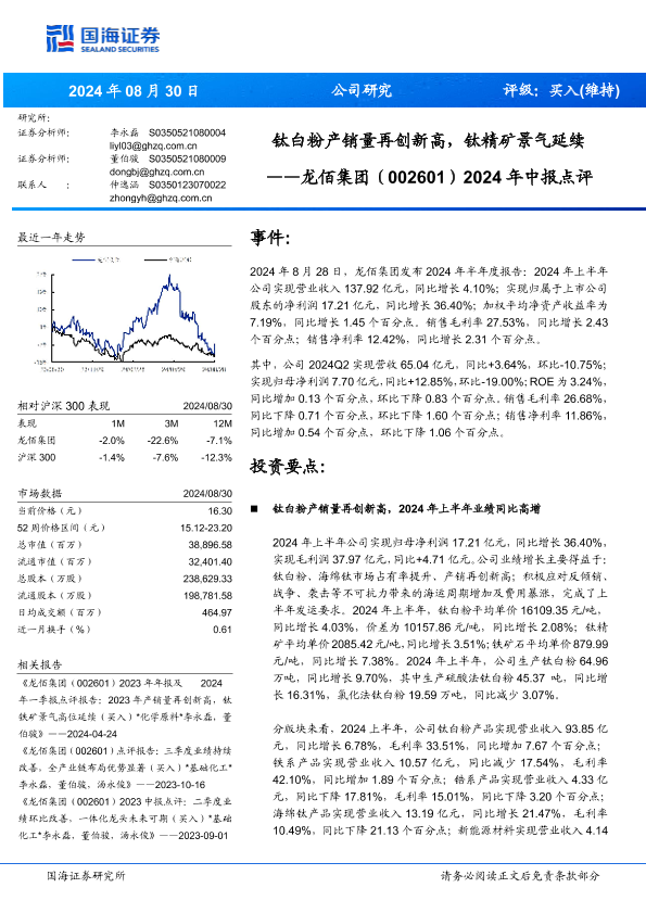【国海证券】【20240830】龙佰集团(002601)2024年中报点评:钛白粉产销量再创新高,钛精矿景气延续-12页