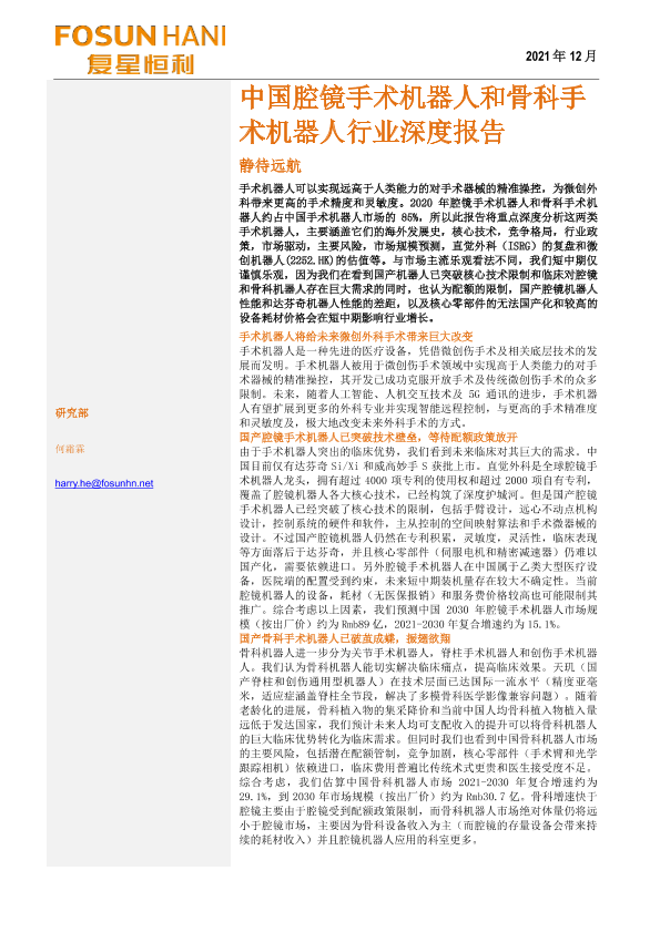 【复星恒利】【20211228】中国腔镜手术机器人和骨科手术机器人行业深度报告-54页