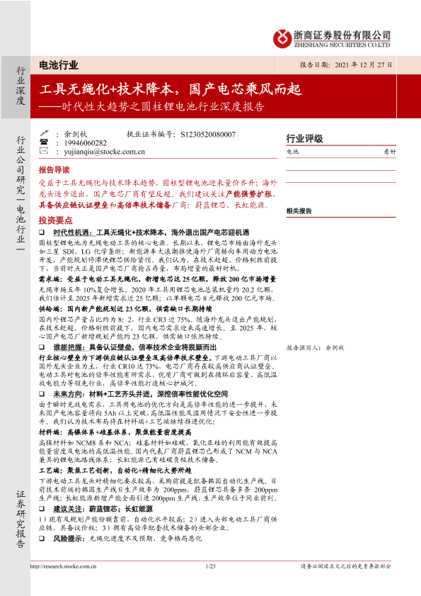 国产电芯 圆柱锂电池 工具无绳化 市场增量 技术降本