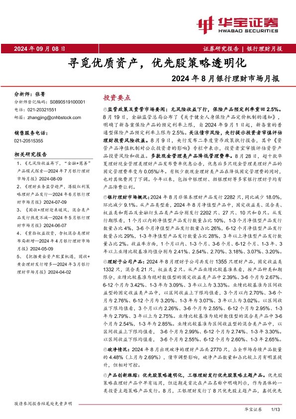 【华宝证券】【20240908】2024年8月银行业理财市场月报:寻觅优质资产,优先股策略透明化-13页