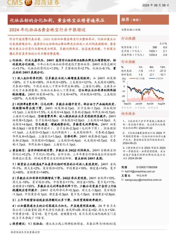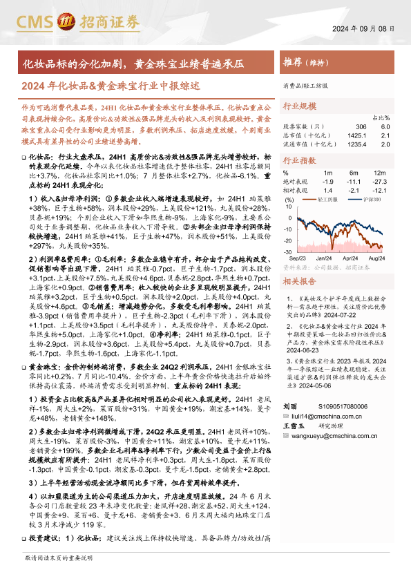 【海通证券】【20240908】2024年化妆品&黄金珠宝行业中报综述:化妆品标的分化加剧,黄金珠宝业绩普遍承压-15页