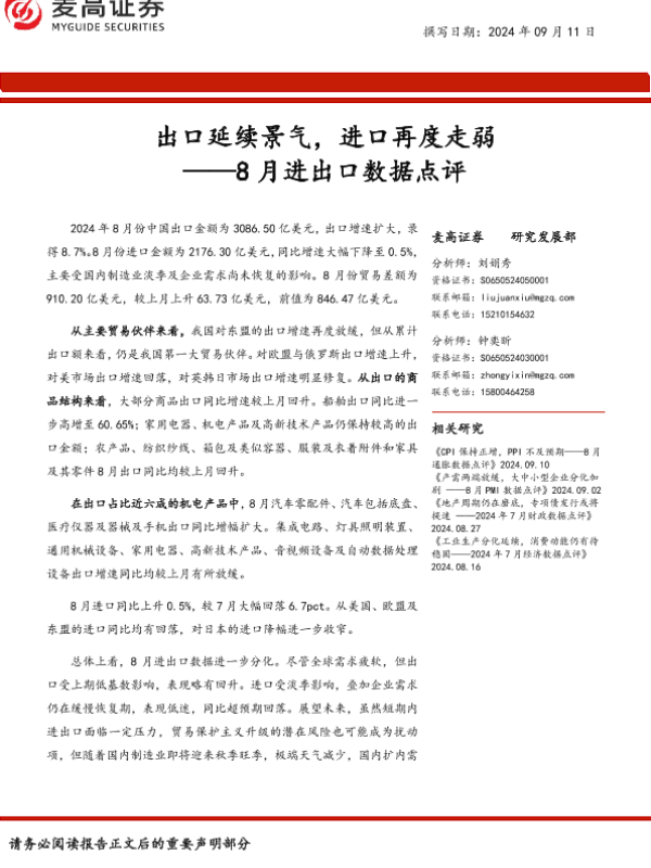 【麦高证券】【20240911】8月进出口数据点评:出口延续景气,进口再度走弱-10页