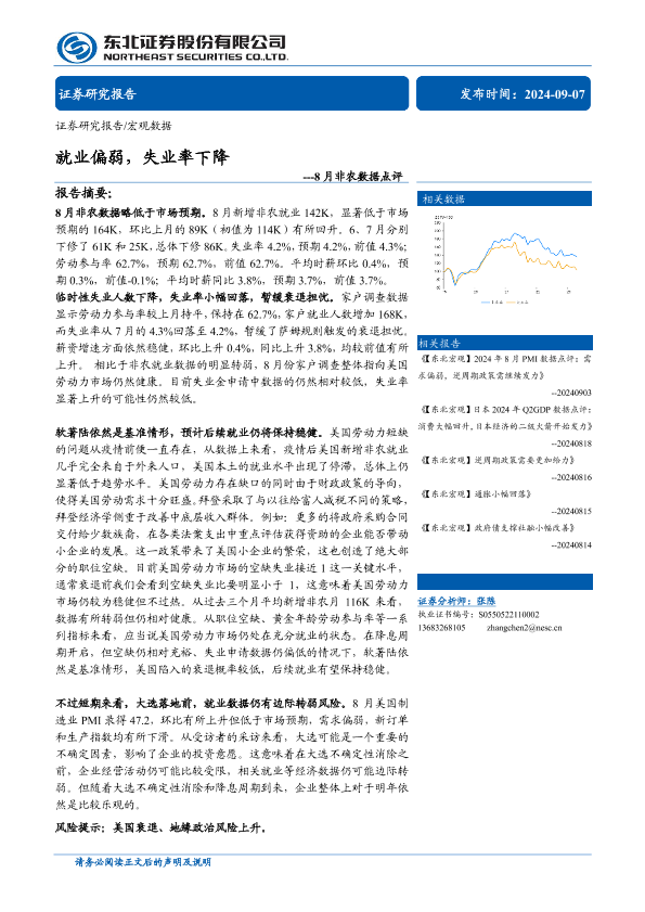 【东北证券】【20240907】8月非农数据点评:就业偏弱,失业率下降-10页