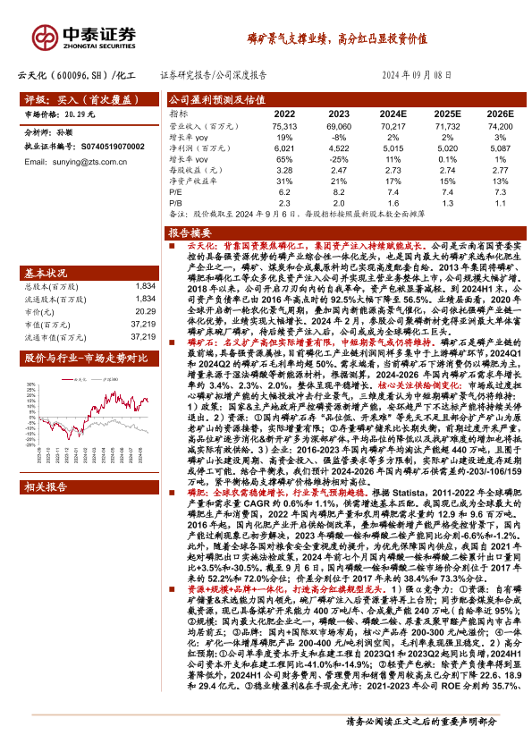 【中泰证券】【20240908】云天化(600096)磷矿景气支撑业绩,高分红凸显投资价值-40页