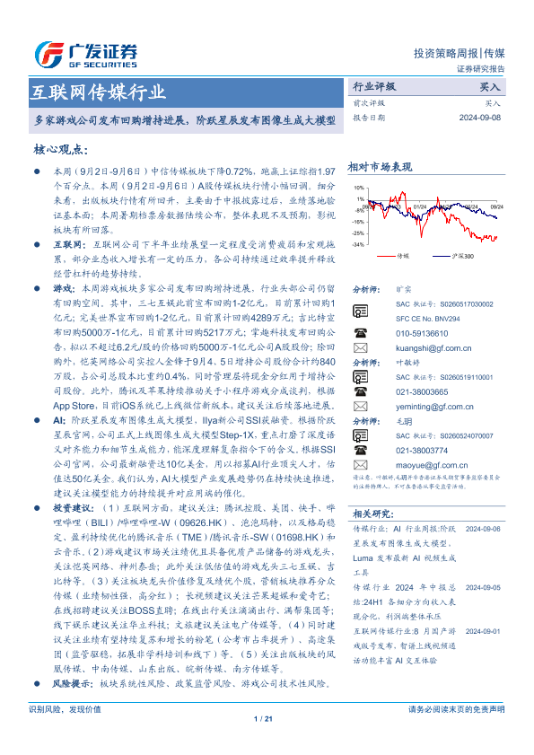 【广发证券】【20240908】互联网传媒行业:多家游戏公司发布回购增持进展,阶跃星辰发布图像生成大模型-21页