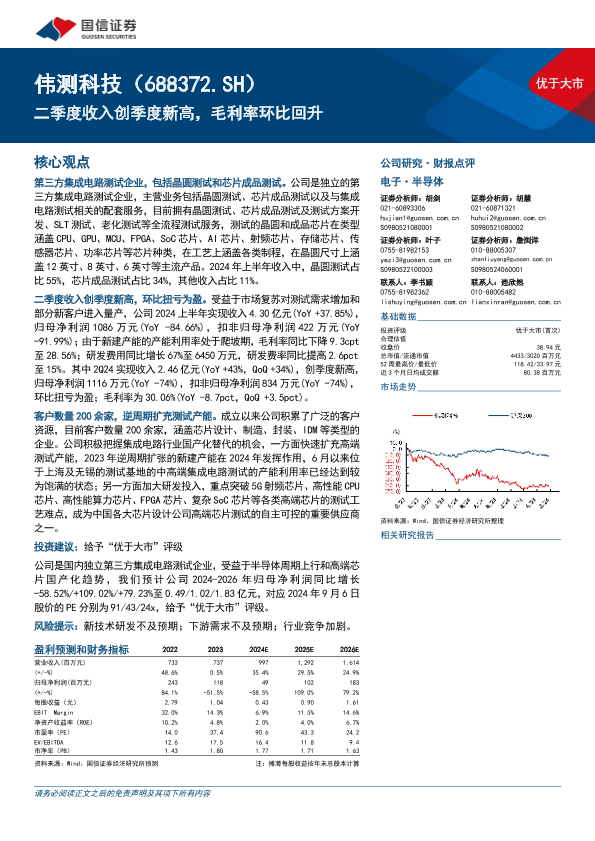 【国信证券】【20240909】伟测科技(688372)二季度收入创季度新高,毛利率环比回升-16页