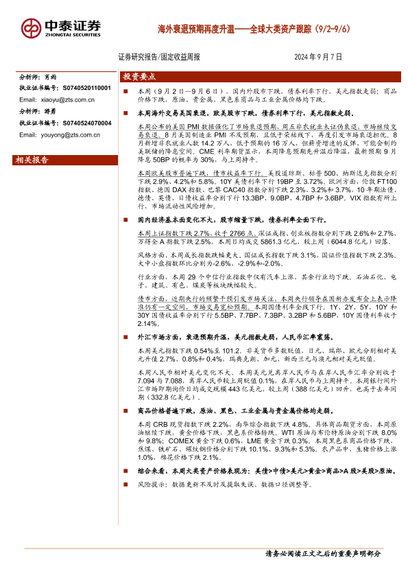 【中泰证券】【20240907】全球大类资产跟踪:海外衰退预期再度升温-12页