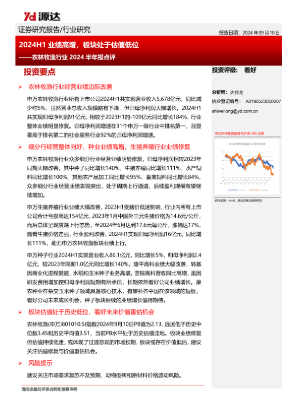 【源达信息】【20240910】农林牧渔行业2024半年报点评:2024H1业绩高增,板块处于估值低位-10页