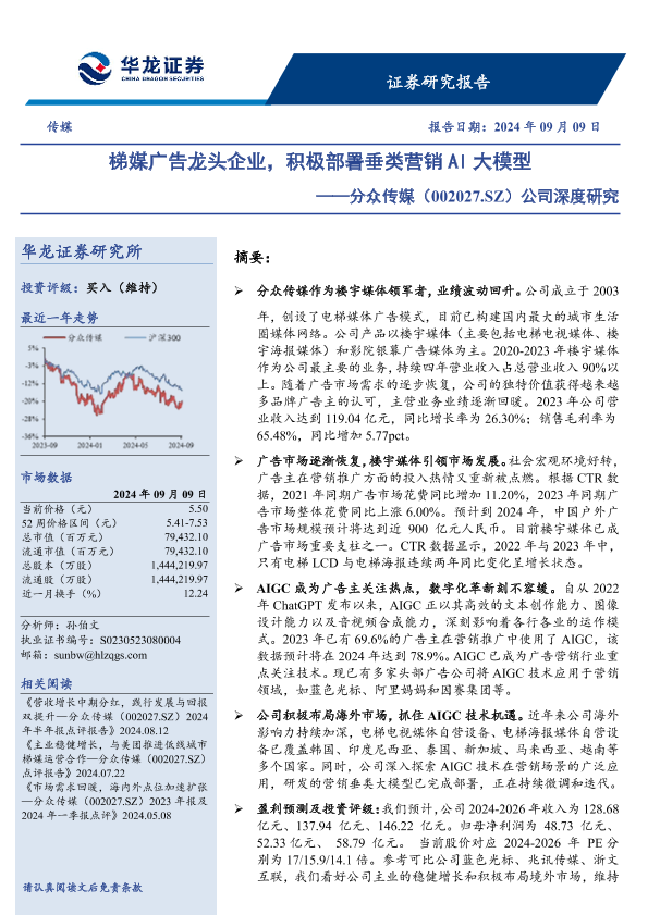 【华龙证券】【20240909】分众传媒(002027)公司深度研究:梯媒广告龙头企业,积极部署垂类营销AI大模型-25页