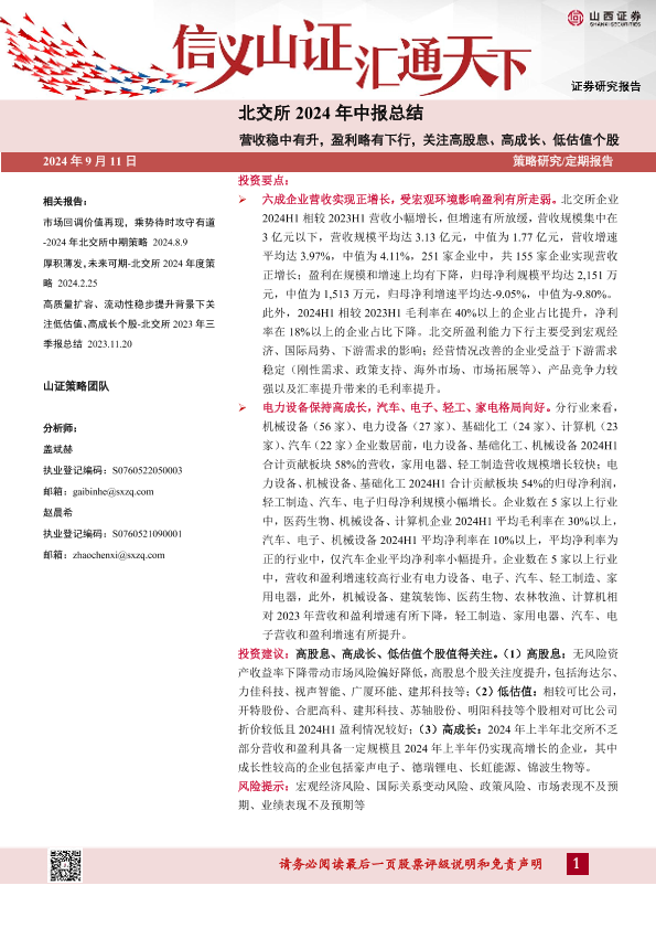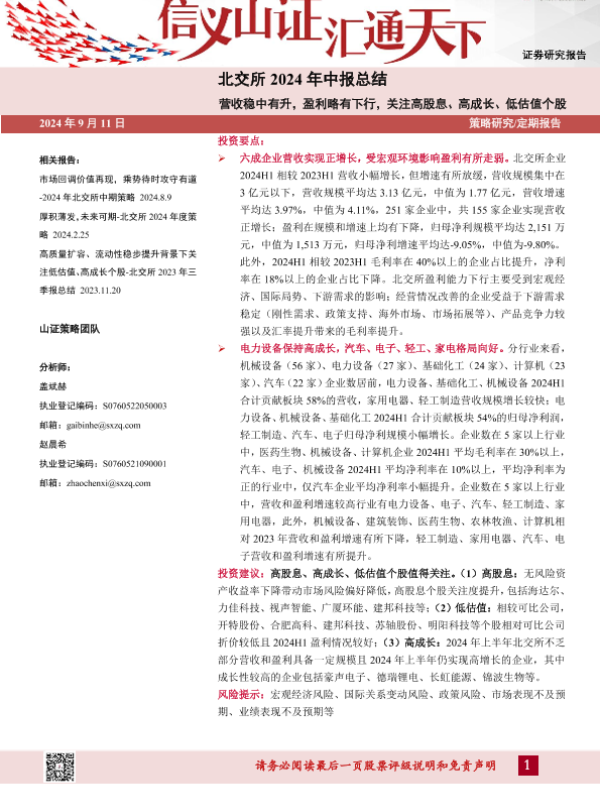 【山西证券】【20240911】北交所2024年中报总结:营收稳中有升,盈利略有下行,关注高股息、高成长、低估值个股-17页