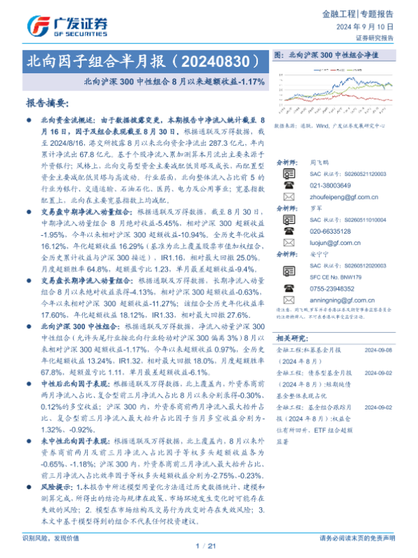 【广发证券】【20240910】北向因子组合半月报:北向沪深300中性组合8月以来超额收益-1.17%-21页