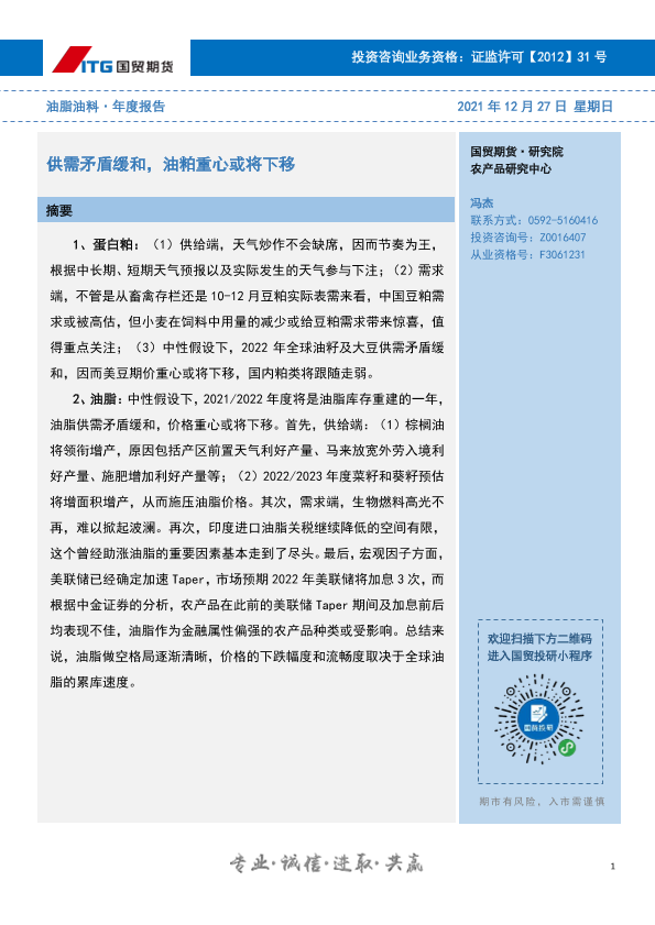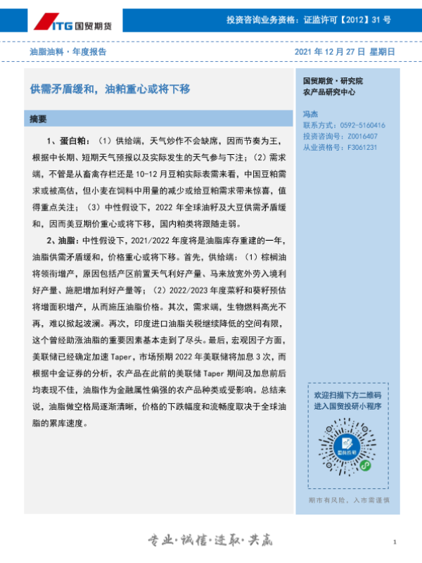 【国贸期货】【20211227】油脂油料·年度报告:供需矛盾缓和,油粕重心或将下移-21页
