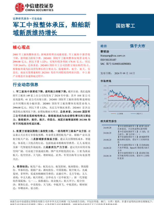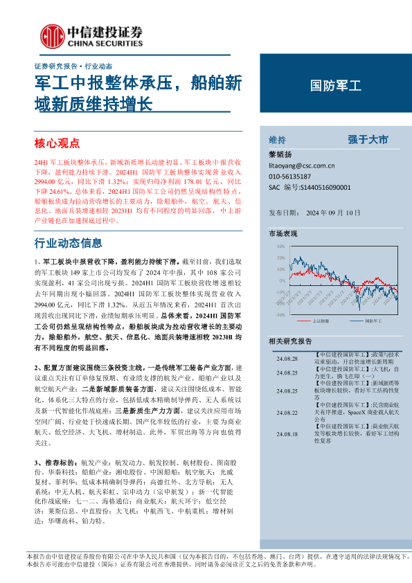 【中信建投证券】【20240910】国防军工行业:军工中报整体承压,船舶新域新质维持增长-28页
