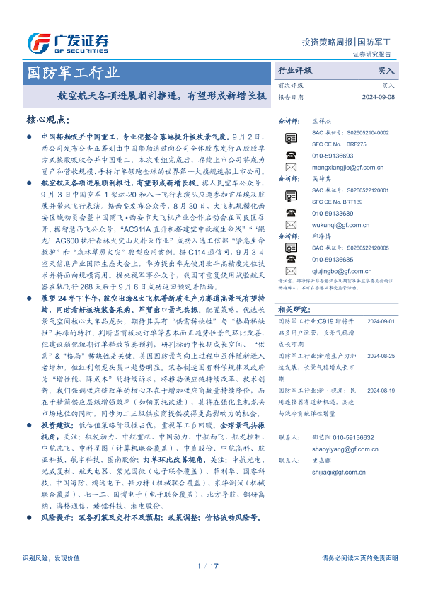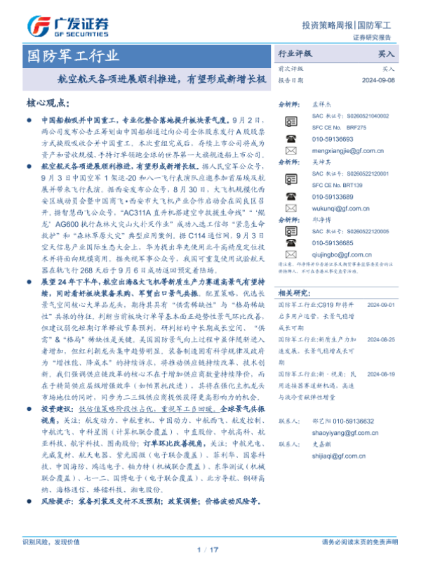 【广发证券】【20240908】国防军工行业:航空航天各项进展顺利推进,有望形成新增长极-17页