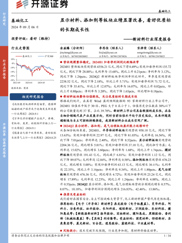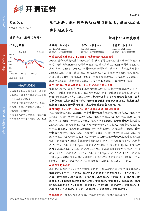 【开源证券】【20240906】基础化工新材料行业深度报告:显示材料、添加剂等板块业绩显著改善,看好优质标的长期成长性-34页