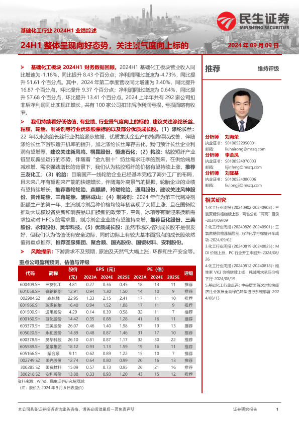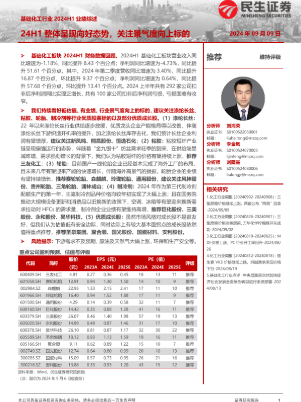 【民生证券】【20240909】基础化工行业2024H1业绩综述:24H1整体呈现向好态势,关注景气度向上标的-25页