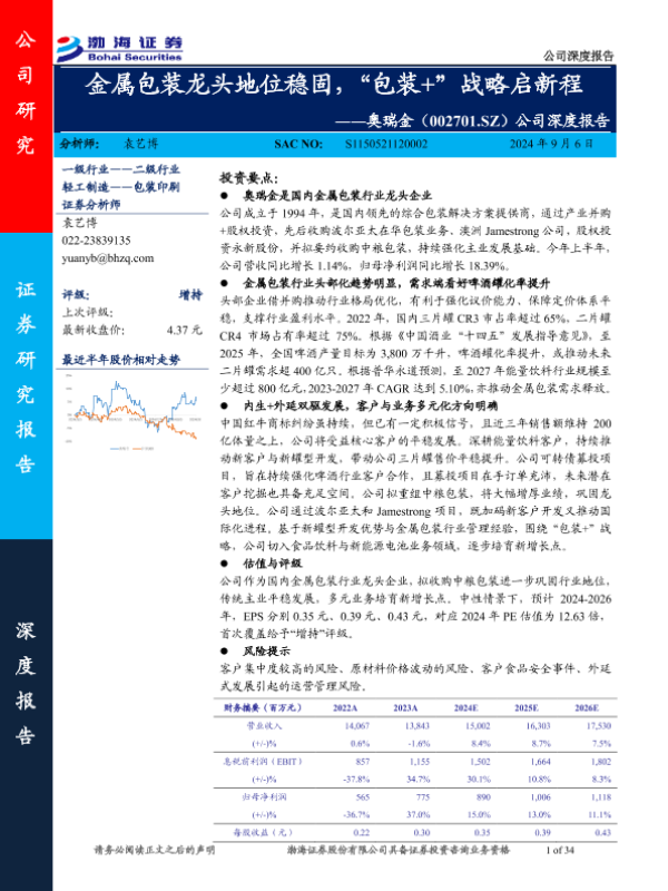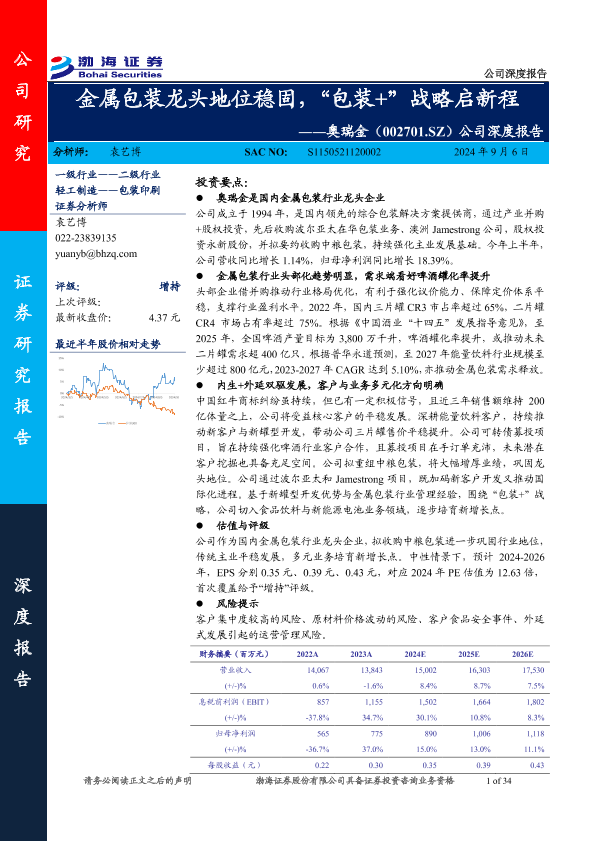 【渤海证券】【20240906】奥瑞金(002701)公司深度报告:金属包装龙头地位稳固,“包装+”战略启新程-34页