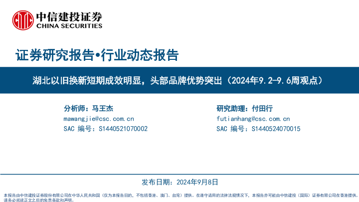 【中信建投证券】【20240908】家电行业:湖北以旧换新短期成效明显,头部品牌优势突出(2024年9.2-9.6周观点)-30页