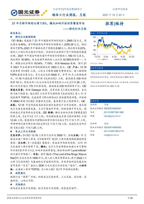 【国元证券】【20211223】游戏行业月报:21年手游市场同比增7.6%,腾讯加码开放世界赛道布局-21页