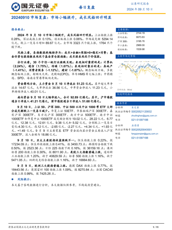 【国元证券】【20240910】20240910市场复盘:市场小幅提升,成长风格回升明显-11页