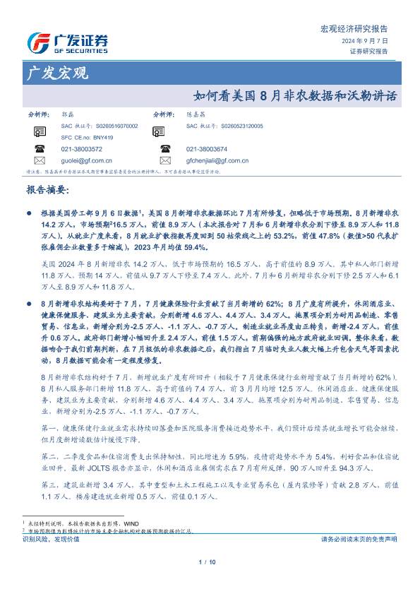 【广发证券】【20240907】如何看美国8月非农数据和沃勒讲话-10页