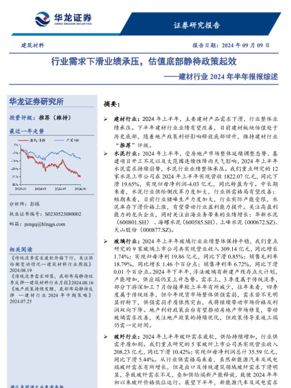 【华龙证券】【20240909】建材行业2024年半年报报综述:行业需求下滑业绩承压,估值底部静待政策起效-22页