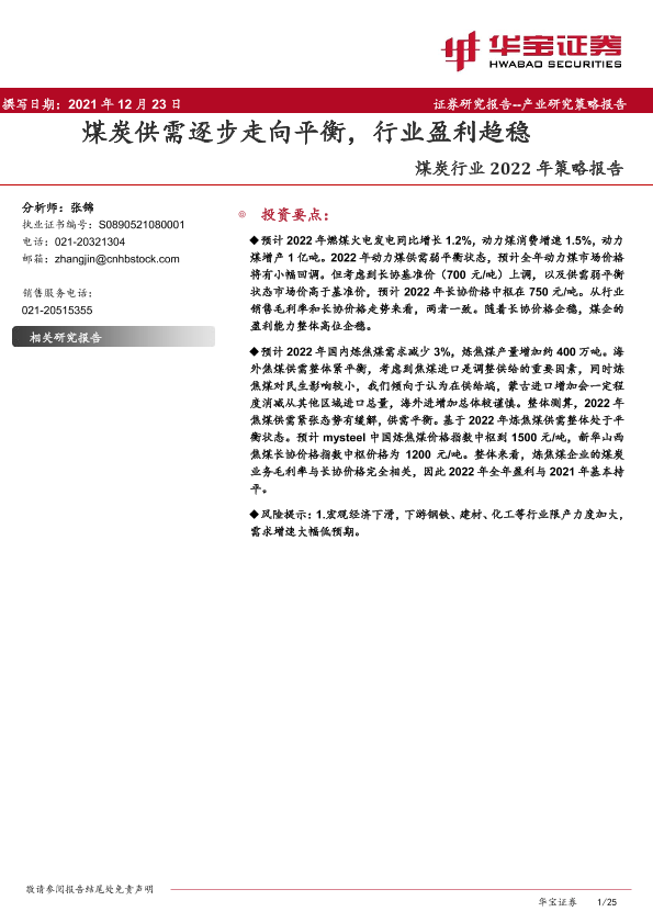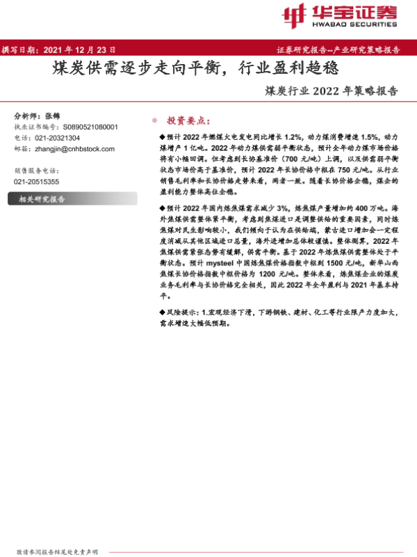 【华宝证券】【20211223】煤炭行业2022年策略报告:煤炭供需逐步走向平衡,行业盈利趋稳-25页