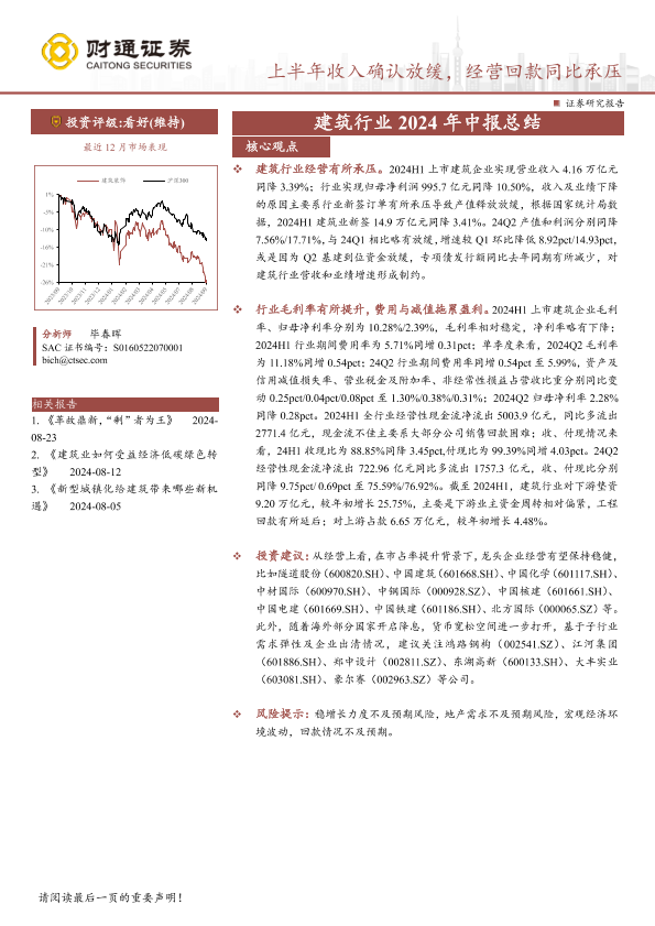 【财通证券】【20240908】建筑行业2024年中报总结:上半年收入确认放缓,经营回款同比承压-18页