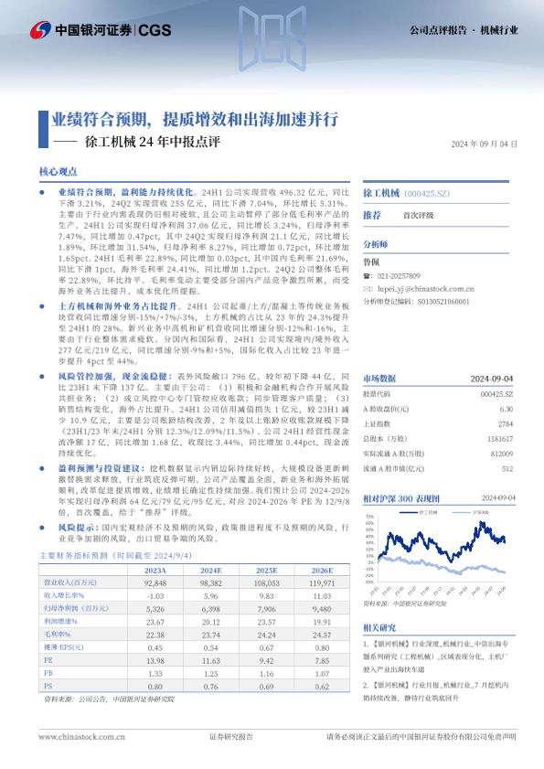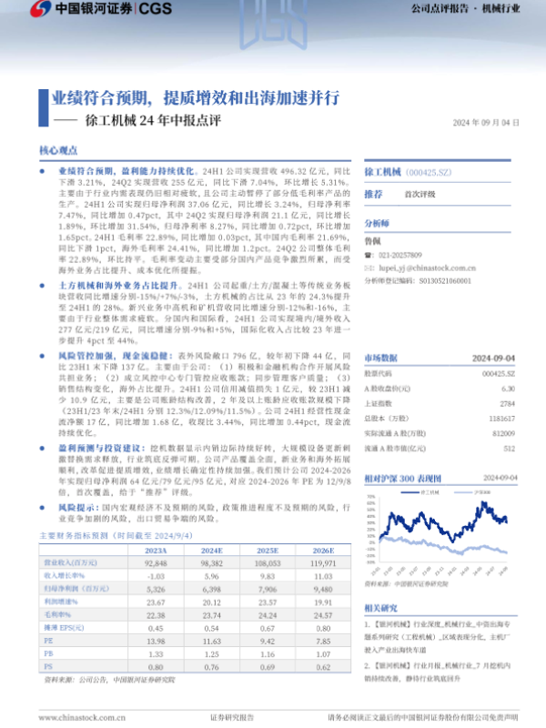 【银河证券】【20240904】徐工机械(000425)24年中报点评:业绩符合预期,提质增效和出海加速并行-17页