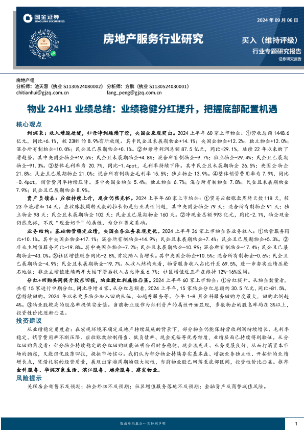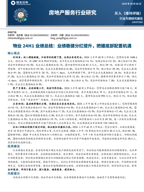 【国金证券】【20240906】房地产服务行业研究-物业24H1业绩总结:业绩稳健分红提升,把握底部配置机遇-18页