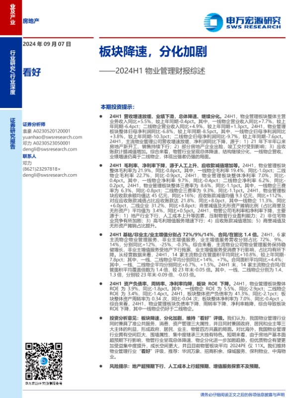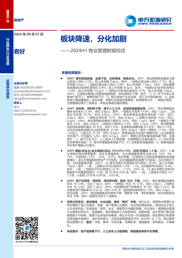 【申万宏源】【20240907】房地产行业2024H1物业管理财报综述:板块降速,分化加剧-20页
