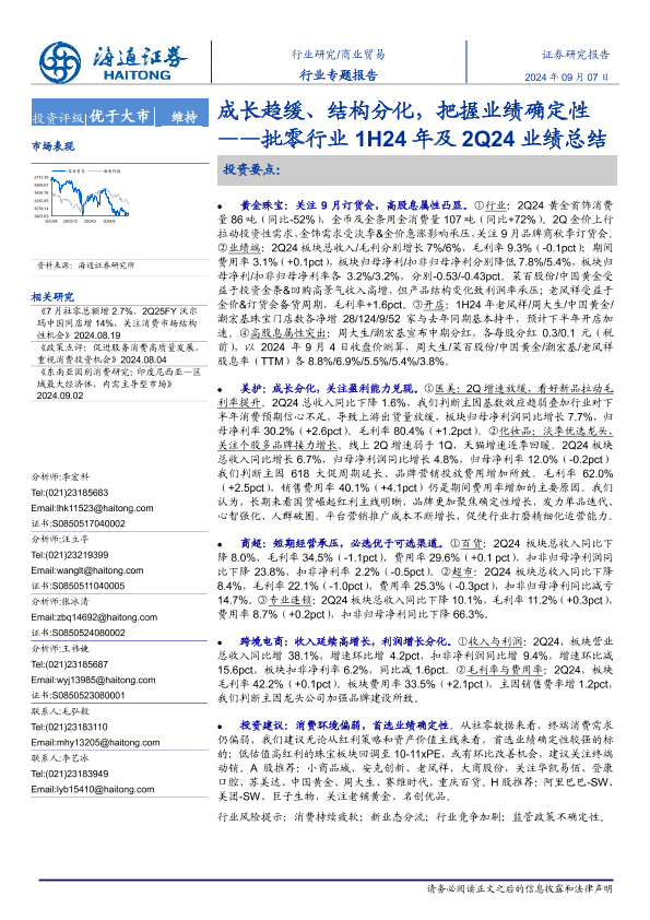 【海通证券】【20240907】批零行业1H24年及2Q24业绩总结:成长趋缓、结构分化,把握业绩确定性-13页