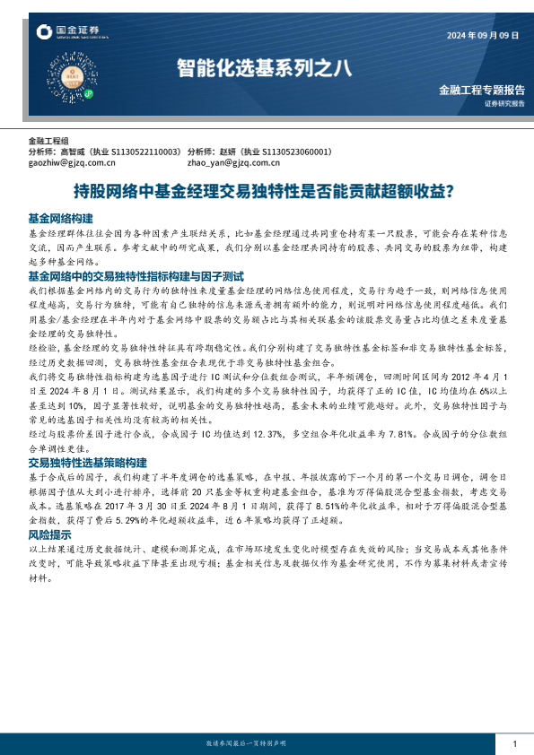 【国金证券】【20240909】智能化选基系列之八:持股网络中基金经理交易独特性是否能贡献超额收益?-16页