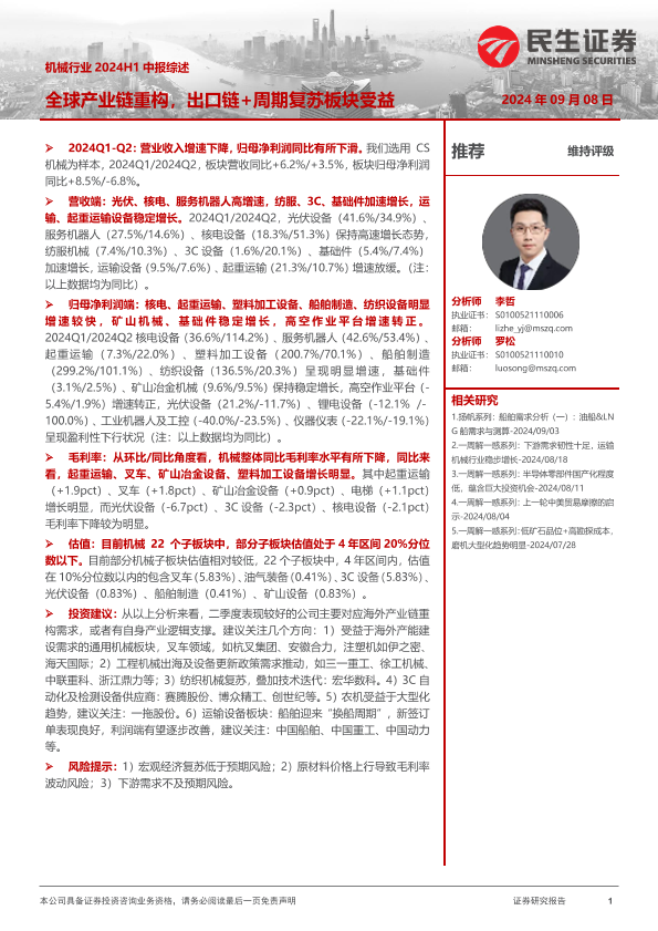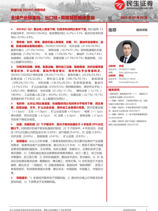 【民生证券】【20240908】机械行业2024H1中报综述:全球产业链重构,出口链+周期复苏板块受益-41页