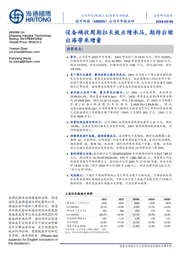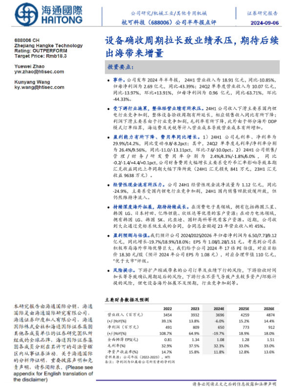 【海通国际】【20240906】杭可科技(688006)公司半年报点评:设备确收周期拉长致业绩承压,期待后续出海带来增量-13页