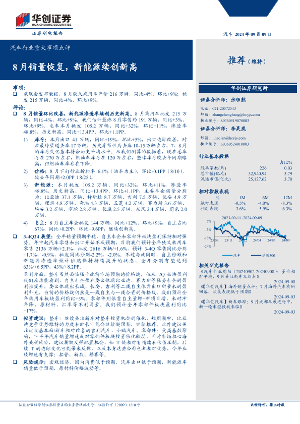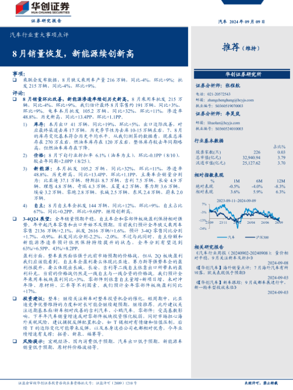 【华创证券】【20240909】汽车行业重大事项点评:8月销量恢复,新能源续创新高-14页
