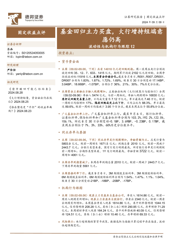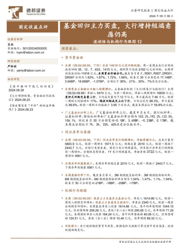 【德邦证券】【20240909】流动性与机构行为跟踪12:基金回归主力买盘,大行增持短端意愿仍高-19页